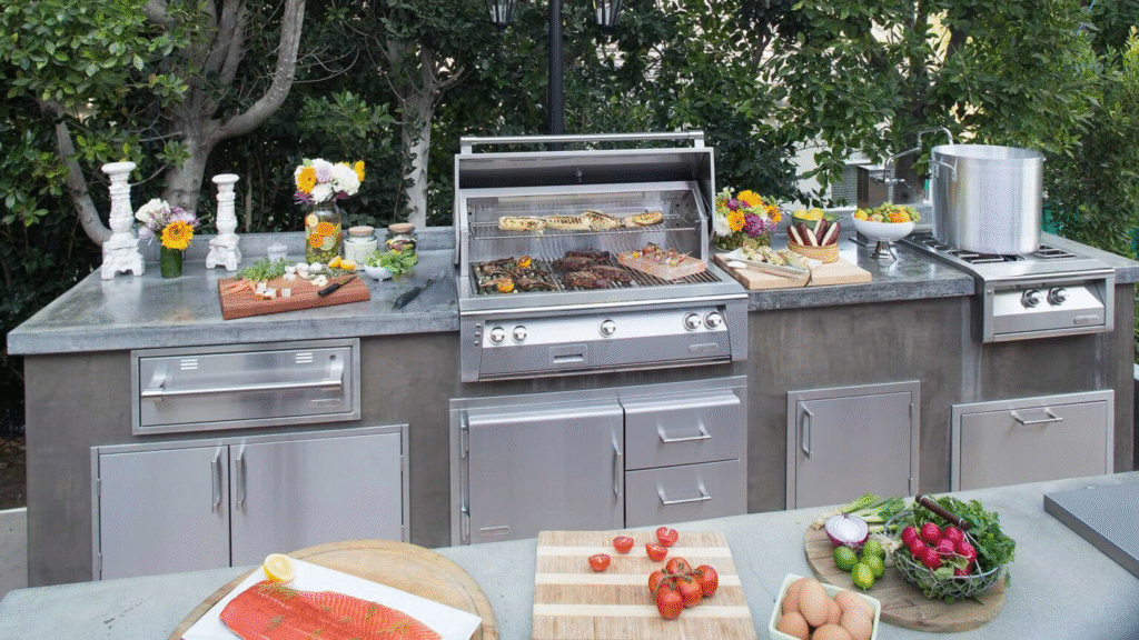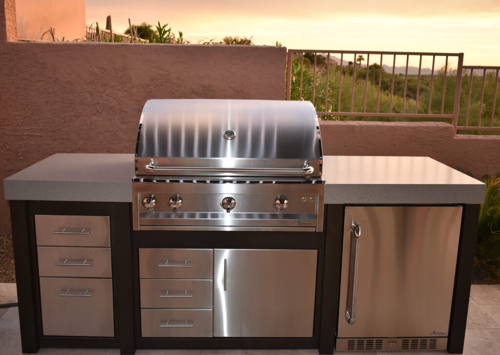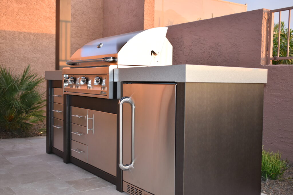 Center: 42” Alfresco grill, 42” Undercounter outdoor refrigerator