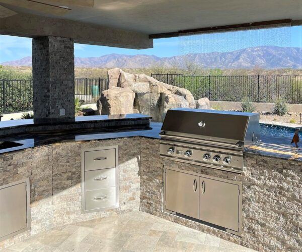 Outdoor Kitchen with 32” Delta Heat, double side burner, paper towel drawer and trash pullout.