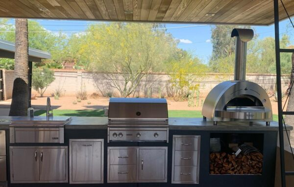 42″ ALFRESCO, 42″ ENCLOSURE WITH DOORS, 14″ ALFRESCO BUILT IN BURNER, 17″ THREE TIER STORAGE DRAWERS, 15″ TRASH CENTER, 30″ DOUBLE ACCESS DOOR, 2 PIZZE GAS PIZZA OVEN