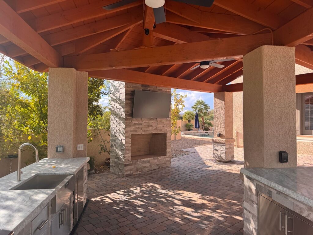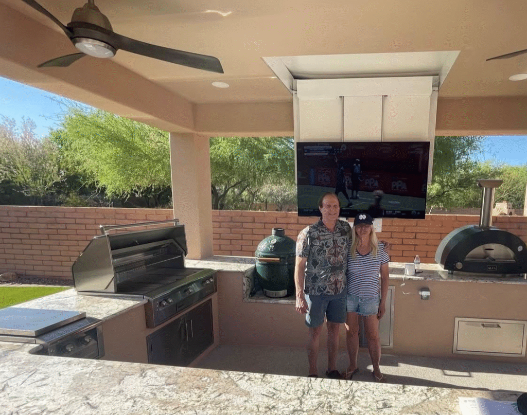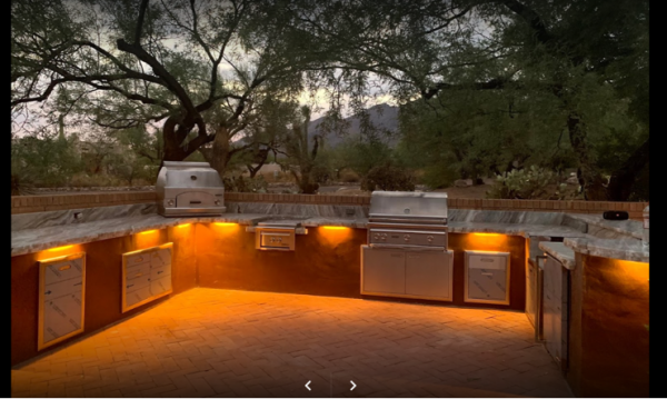 42″ Alfresco sear zone grill with 42″ access door, Big Green Egg, 2 Pizze gas pizza oven, dual trash/recycle center, 17″ paper towel holder w/ 3 drawers, Artisan 24″ undercounter refrigerator, 2 ceiling fans, can lighting and a 65″ Samsung Television with Nexus flip down and extend TV lift
