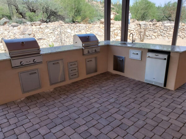 Custom outdoor kitchen with two 26” Delta Heat grills, outdoor refrigerator, trash center, and storage drawers.