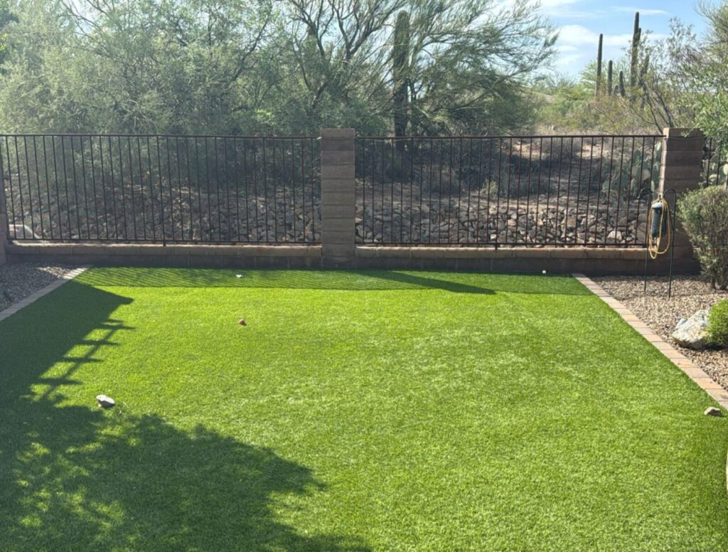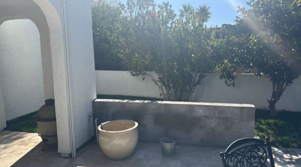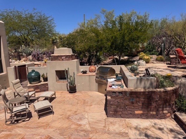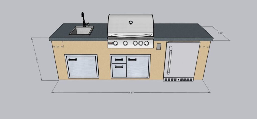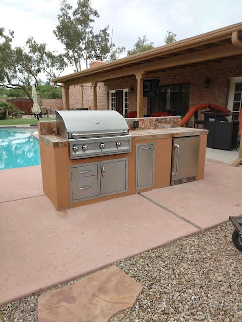 After image- New 9 1/2ft outdoor masonry Kitchen. 32″ Summerset grill, Door/Drawer combo under grill, Outdoor refrigerator, Sink and access door for plumbing. Granite counter top, stucco to match house.