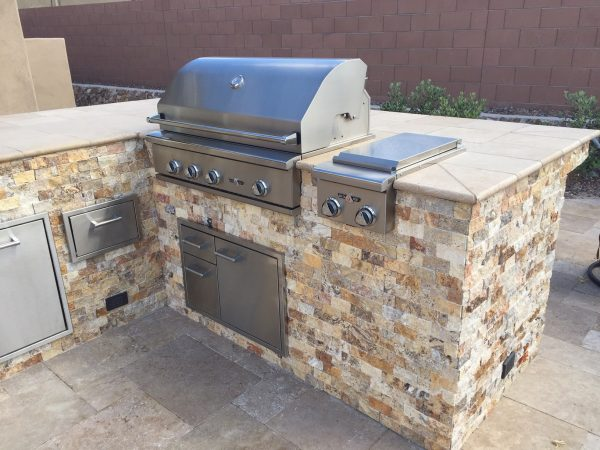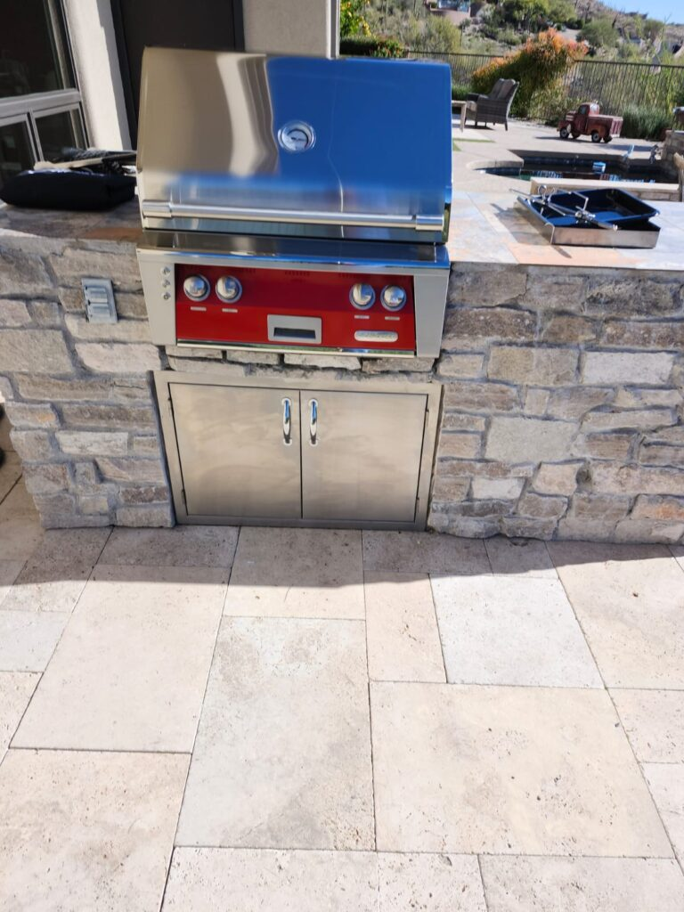 36” Artisan gas grill, trash, and fridge. Custom built and designed island with a backsplash by Flame Connection.