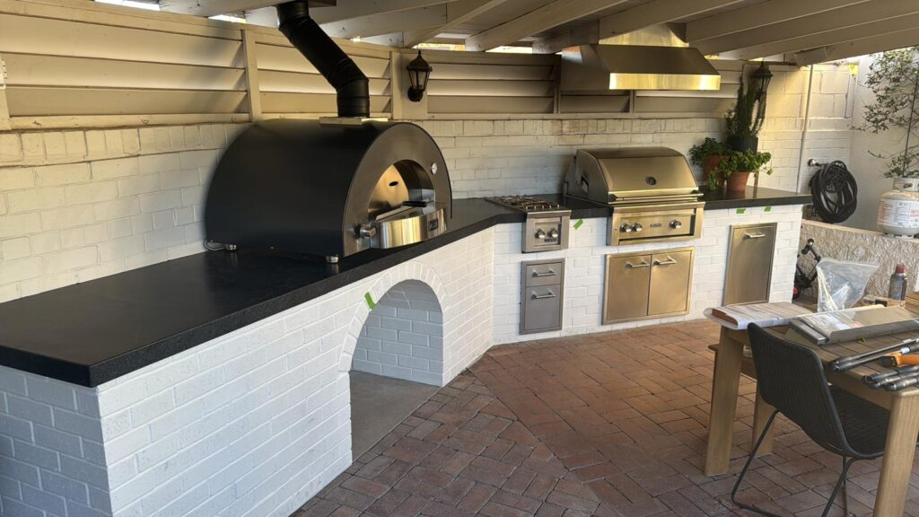 Hamilton Outdoor Kitchen Build: Alfa gas pizza over with hybrid kit, Lynx Trident grill, Lynx double side burner, Lynx door with double drawers.