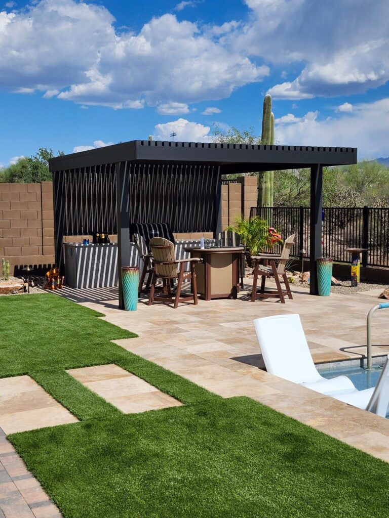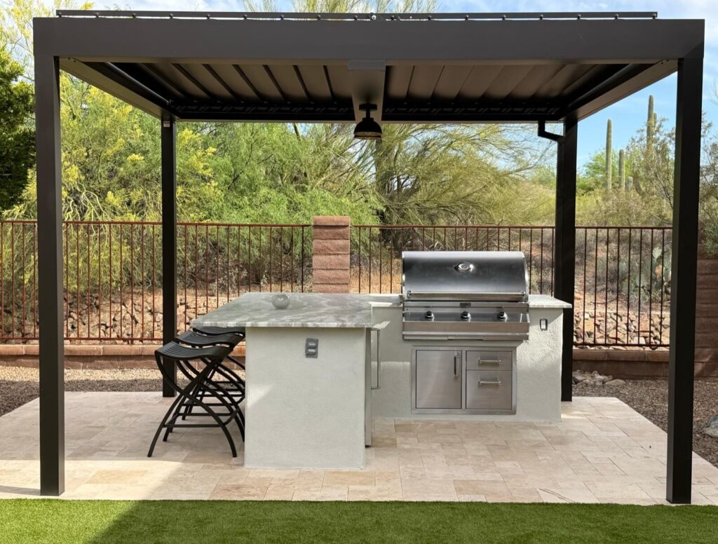 10ft X 12ft Equinox remote control louvered shade structure and Outdoor Kitchen with Fire Magic grill.