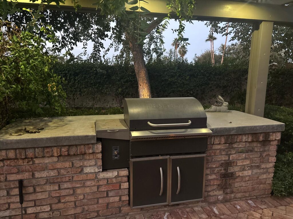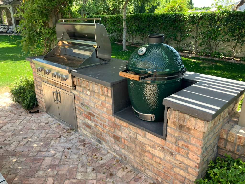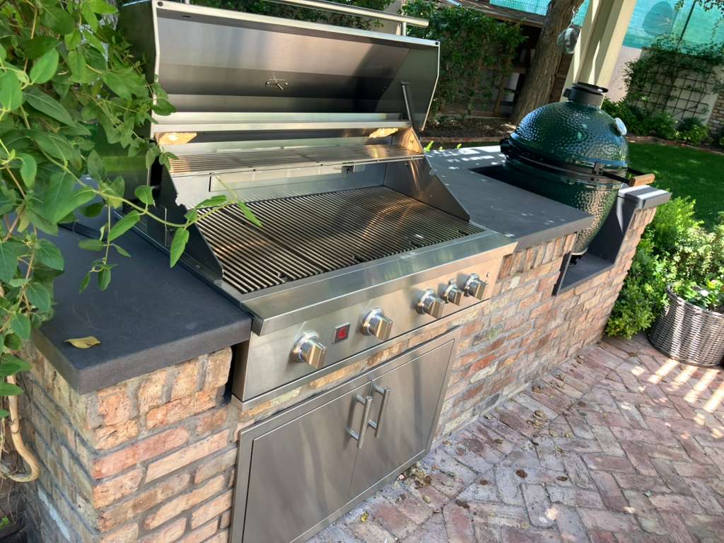 Removed old pellet grill, remodel kitchen with new gas Summerset TRL 40 built in grill, double doors and a large Big Green Egg.